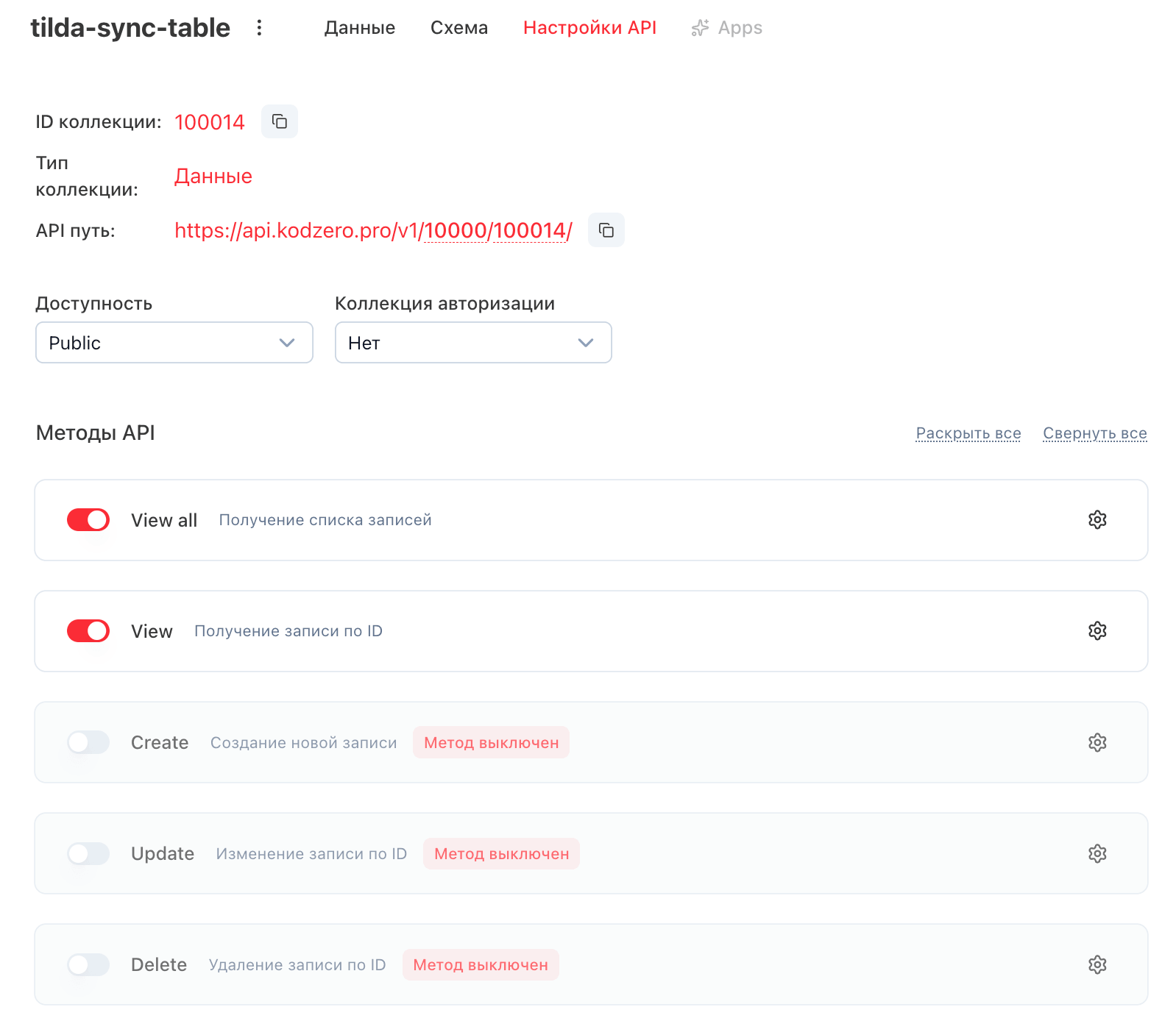 Важно! Необходимо отключить методы API, которые нам не нужны. Оставим включенным только «View All» и «View»:
