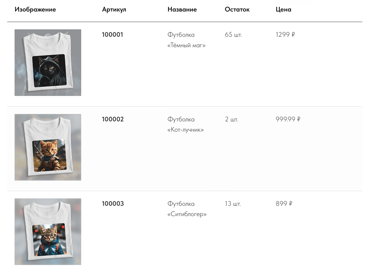 | 100001 | Футболка «Тёмный маг» | 65 | 1299 | https://s3.twcstorage.ru/b3c41028-d393b949-52c0-4ce6-8017-ca2f7d617e15/kodcats-tshirts/black-800.webp |